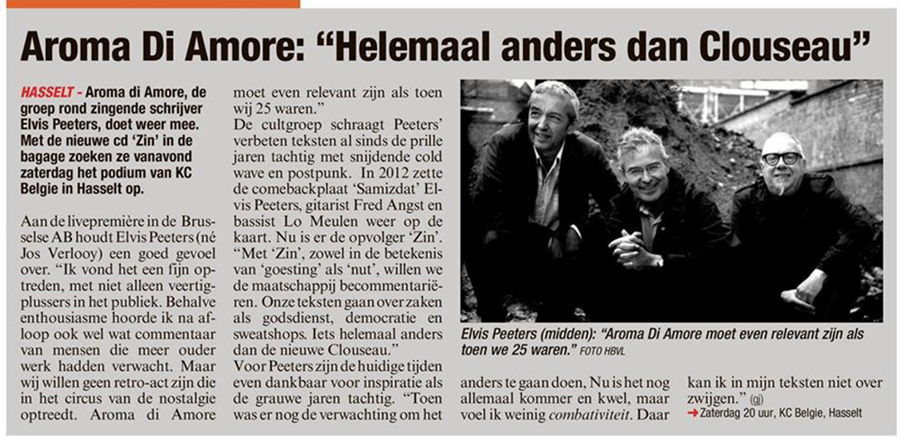 De groep rond gitarist Fred Angst, bassist Lo Meulen en zanger Elvis Peeters maakte, na een paar felgesmaakte compilaties, in 2012 een stevige come-back met het album ‘Samizdat’, en nu is er opvolger ‘Zin’, hun meest veelzijdige plaat ooit. Daar waar veel tijdgenoten de jaren 80 blijven recycleren gaat Aroma Di Amore resoluut voor een hedendaagse sound. Daarom ook vroegen ze om de nummers te laten mixen door Jürgen De Blonde (De Portables, Köhn), die een gelijkaardige eigenzinnigheid aan de dag legt als de heren zelf. U zal het geweten hebben...