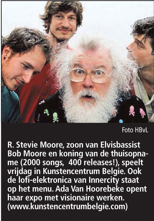 Deze zoon van Bob Moore (bassist van Elvis Presley) bestempelt zichzelf als componist, arrangeur, improvisator, producer, comedyschrijver, schetsblokartiest, autodidact instrumentalist, filmmaker en ware bon vivant. Als curator van zijn eigen museum leidt R. Stevie Moore een vrij rustig en teruggetrokken leven in Nashville, Tennessee (na dertig jaar New Jersey). Maar tegenwoordig grijpt hij elke gelegenheid aan om de wereld rond te trekken met zijn unieke muziek. Een overzicht van het opmerkelijk arsenaal videowerken voor huisgebruik dat hij over de jaren heen produceerde kregen we in kunstencentrum BELGIE eerder al te zien tijdens het Kraak Festival in 2007. Na het Primavera Club Event in Barcelona staat R.Stevie Moore nu eindelijk en voor het eerst live mét band op het BELGIE-podium.