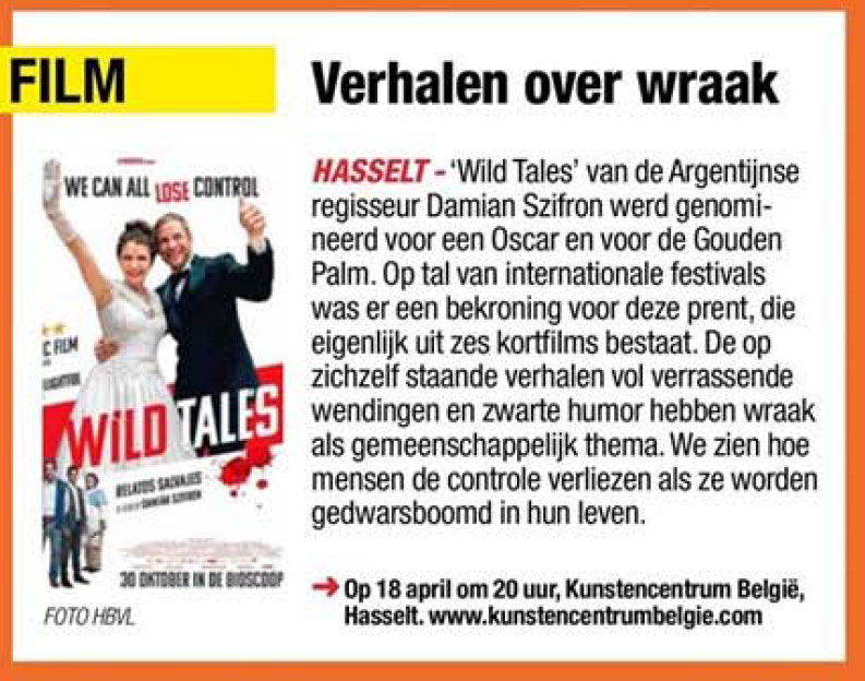 Wild Tales serveert ons zes korte, op zichzelf staande verhalen vol zwart-komische humor. Vol verrassende wendingen en plots. Het overkoepelende thema van de verhaallijnen is wraak. We zien hoe alledaagse mensen de controle kunnen verliezen als ze worden gedwarsboomd in hun leven. In die zin is de film een stevige satire op de hedendaagse samenleving. De filmdelen beginnen steeds eenvoudig en herkenbaar,maar al snel lopen comunicatie en affaires helemaal uit de hand. De film is inventief, hysterisch en verfrissend. Argentijns regisseur Damián Szifron schreef alle zes de kortfilms. De film is geproduceerd door Pedro en AgustÌn Almodóvar. De immer-meeslepende soundtrack komt wederom van niemand minder dan Gustavo Santaolalla (Tevens van de partij in Almodóvars Amores Perros & Babel). Wie eerder in Kc BELGIE Almodóvars films als La Mala Educacion, Volver, Los Abrazos Rotos of La Piel Que Habito heeft gezien, zal het niet ontgaan dat Almodóvar opnieuw, met flair en intensiteit inzoomt op de donkerste kant van de menselijke psyche.