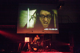 Vlaamse letteren Herman Brusselmans virtueel in zijn performance.