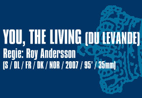 Een brassband die zelfs bij familie en vrienden niet op succes kan rekenen. Een kettingrokende en alcoholverslaafde vrouw die droomt van een motorfiets. Een kapper uit het Midden-Oosten die wraak wil nemen op een racistische klant. Het zijn maar enkele van de tientallen kleurrijke figuren die ‘You, The Living’ bevolken. Melancholisch als zondagse regen en pittoresk als een levend schilderij worden we in 57 scènes meegenomen op een gemeenschappelijke zoektocht naar het ware geluk. Een hopeloze zoektocht van bevreemdende personages die proberen het hoofd boven water te houden maar steevast worden gedwarsboomd door een falende communicatie. ‘You, the living’ verbeeldt het leven als een noodzakelijk kwaad. Geen grote thema’s bij Andersson maar klein leed en kleine problemen die de meeste van zijn hoofdpersonen ver boven het hoofd groeien.