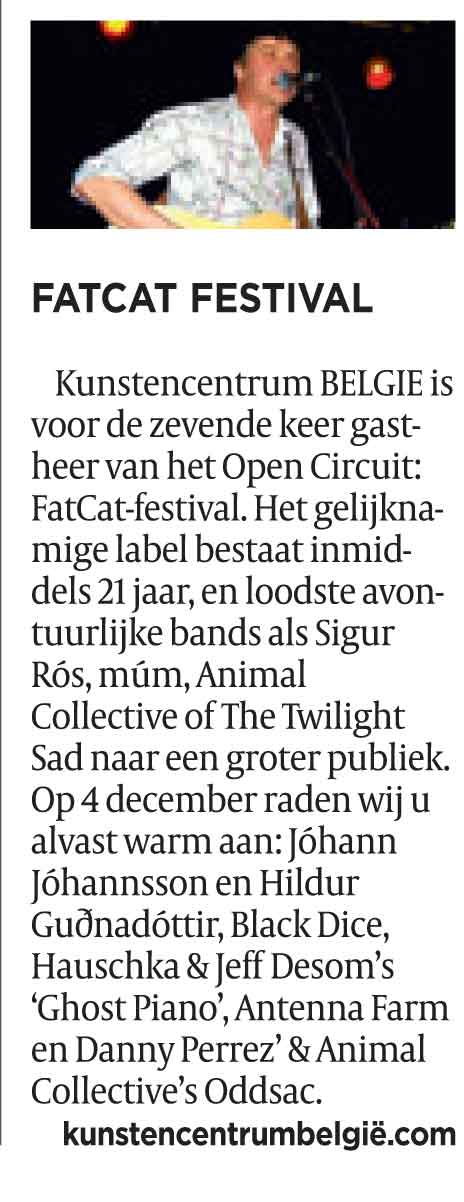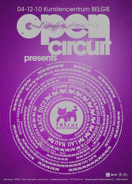 Kunstencentrum BELGIE is voor de zevende keer gastheer van het Open Ciruit: FatCat-festival. Het FatCat-label bestaat inmiddels 21 jaar, ging van start als onafhankelijke platenwinkel in 1989 en groeide langzaam uit tot een avontuurlijk label dat bands als Sigur Ros, múm, Animal Collective, Frightened Rabbit, The Twilight Sad, No Age van obscuriteit naar het grote publiek wist te loodsen.