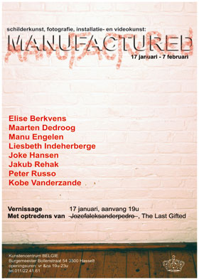 Enkele gedreven studenten beeldende kunst uit Hasselt, Genk en Maastricht nemen het heft in eigen handen, verenigen zich in een naamloos gelegenheidscollectief en halen hun werk resoluut uit de schoolse context. Manu Engelen, Peter Russo, Elise Berkvens, Joke Hansen, Liesbeth Indeherberge, Kobe Vanderzande, Maarten Dedroog en Jakub Rehak presenteren ‘Manufactured’, een denkbeeldige plaats waar 8 jonge kunstenaars elkaar en het publiek ontmoeten.