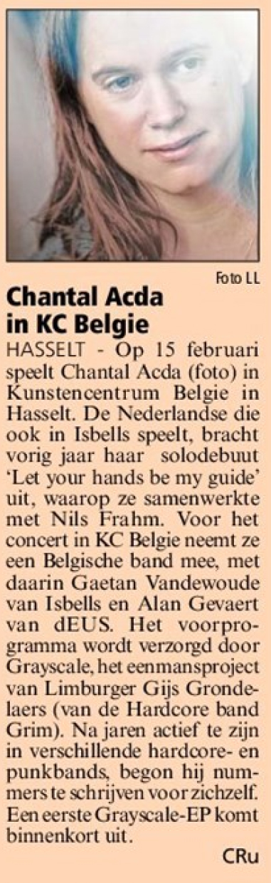 CHANTAL ACDA + GRAYSCALE 15 februari 2014 link: http://www.kunstencentrumbelgie.com/programma/concert/chantalacda.htm