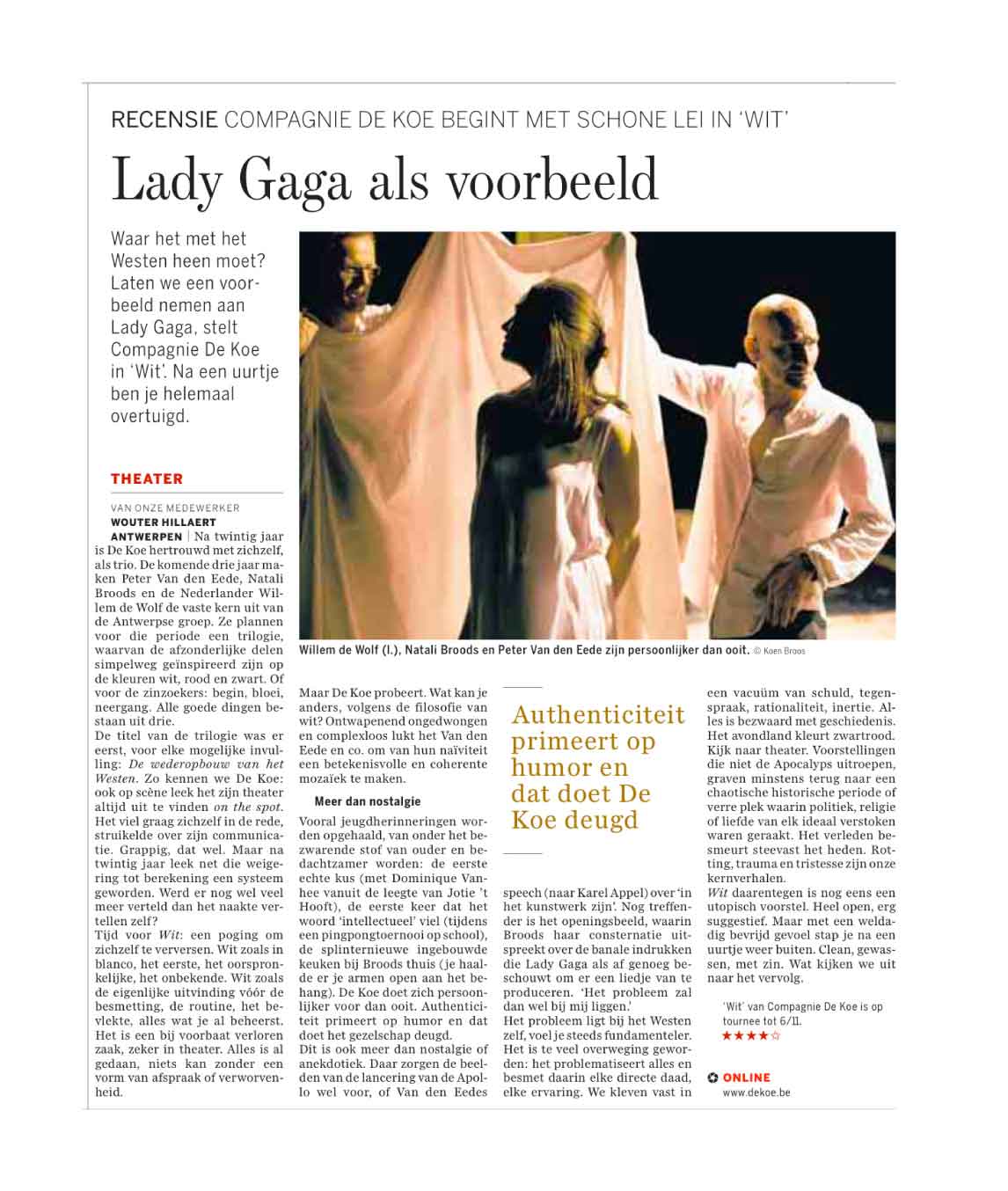 De Wederopbouw van het Westen (wit) door Cie De KOE 24 september 2010 link: http://www.kunstencentrumbelgie.com/programma/theater/dewederopbouwnew.htm