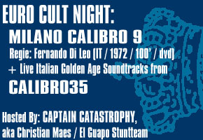 Captain Catastrophy vindt het dan ook meer dan tijd om ook u te laten meegenieten van Fernando Di Leo’s magistrale ‘Milano Calibro 9’. Maar... er is meer. CALIBRO 35 -een Italiaanse band met connecties in Muse, Franz Ferdinand, Arto Lindsay, Stewart Copeland...- eigende zich de soundtracks van exploitatiefilms uit het thuisland van de jaren zestig en zeventig toe en brengt tijdens dit live concert schitterend werk van meesters als Ennio Morricone en Luis Bacalov.
