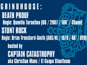 Quentin Tarantino en Robert Rodriguez dachten dat het Europese publiek niet vertrouwd was met het grindhousefenomeen. Maar dat was buiten kunstencentrum BELGIE en de vlammende gehoornde helmdrager ‘Captain Catastrophy’ (aka Christian Maes) gerekend. Deze menselijke toorts/stuntman van het Hasseltse sleazy rockcombo El Guapo Stuntteam, viert zijn obsessie voor cult- en b-films bot door een (wan)smaakvolle filmavond samen te stellen in de zuiverste grindhousetraditie. Tarantino’s ‘Death Proof’ komt dan uiteindelijk toch terecht in het juiste ‘Grindhouse’-kader gezien de Captain u ook nog ‘Stunt Rock’ voorstelt, een seventies cultklassieker die stuntwerk, rock en magie schaamteloos combineert. Verder haalt Captain Catastrophy nog zijn verzameling cultvideohoezen, vintage posters en andere b-filmmemorabilia van onder het stof en stuurt hij u, bij wijze van stunt, de nacht in met verrassende trailers en gastdeejays.