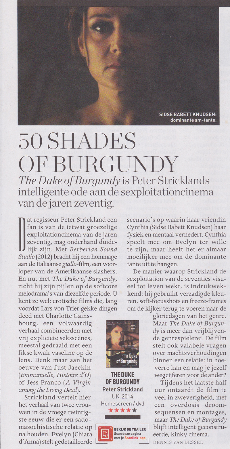 Slechts enkele maanden nadat Hollywood het concept sadomasochisme grondig infantiliseerde in 50 Shades of Grey, levert regisseur Peter Strickland zowaar een volwassen, bedachtzame film af over hetzelfde onderwerp. Hoewel de kans klein is dat The Duke of Burgundy door evenveel mensen gezien zal worden: Stricklands uitdagende genre-spielerei is nét iets minder nadrukkelijk gericht op gibberende vrouwen en aanverwanten.