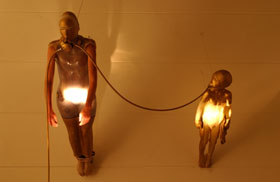 Een performer en een lege polyester figuur representeren twee individuen die invloed hebben op de elkaar. De horizontale figuur drukt de rechtopzittende figuur achterover, de liggende figuur zorgt voor ruimtelijkheid, openheid, schoonheid. Hun hoofd is samengebracht, als geestelijke samensluiting. Zitten is anders dan liggen-zweven, vertikaal en horizontaliteit. De lichamelijke aanwezigheid, en de lege holten. De connotatie met het gesuis van een zeeschelp, en de verstrikking van het hoofd in het brein van de holte. Het idee komt van de implosie van een gezinsstructuur, de teloorgang ervan. Het verdwijnen van deze essentiele bouwsteen resulteert in een onevenwichtige maatschappij.