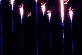 Een vuurregen. In een donkere ruimte vallen druppeltjes vuur in water. Op het eerste zicht lijken de druppels op vuurvliegjes die uit de hemel vallen. Kleine blauwe lichtjes verschijnen en verdwijnen dan terug in de duisternis.