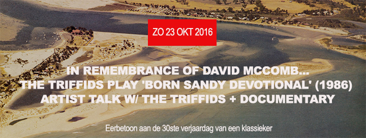 U kan dit bericht niet goed lezen > klik hier voor de webversie ! AN EVENING WITH THE TRIFFIDS, In Remembrance of David Mc Comb, Kunstencentrum BELGIE 2006 THE TRIFFIDS - A SECRET IN THE SHAPE OF A SONG, KcB OPEN CIRCUIT- Pand Koloniale Waren 2010 LOVE IN BRIGHT LANDSCAPES, opnames en support documentaire Kc BELGIE / OPEN CIRCUIT 2015 ------------------------------------------------------------------------------------------------------------------------------------------------------------------------------------- ‘Born Sandy Devotional’ – één van de invloedrijkste Australische albums ooit - wordt 30 dit jaar en dat moet gevierd worden. Het album bevatte prachtsongs als ‘Wide Open Road’, ‘Life Of Crime’ en ‘Stolen Property’ die wijlen Humo-journalist Marc Mijlemans omschreef als ‘onvervalste klassiekers’. Het desolate Australische landschap fungeerde als metafoor voor eenzaamheid en verlies, een thematiek die als rode draad door het werk van The Triffids liep. Landgenoot Nick Cave is fan en inaugureerde hen in ’08 in de Australian Rock And Roll Hall of Fame. De Morgen, Focus Knack en De Standaard nemen steeds het woord ‘meesterwerk’ in de mond als het over ‘Born Sandy Devotional’ gaat. En ook de wereld leek hen het afgelopen decennium niet te zijn vergeten. Hun albums werden de afgelopen jaren opnieuw geremasterd/heruitgebracht, er verscheen een boek over The Triffids (‘Vagebond Holes’) alsook een postume gedichtenbundel (‘Beautiful Waste’) van frontman David McComb die in ’99 op illustere wijze om het leven kwam. The Triffids beschouwden België steeds als hun tweede thuis en het is dan ook niet verwonderlijk dat er in het verleden reeds een tweetal retrospectieve concerten (in het Leuvense Stuk alsook in Kunstencentrum BELGIE) plaats vonden. Naar aanleiding van de 30ste verjaardag van hun doorbraakalbum besloten de overgebleven Triffids-leden nog één keer naar Europa af te zakken en middels een laatste eerbetoon aan ‘Born Sandy Devotional’ het album in het panthenon van meesterwerken te katapulteren. Hierbij passeren ze slechts in drie Europese steden: Londen (waar de band tijdlang resideerde), de Amsterdamse Paradiso en onze eigenste AB. Tot de guest behoren o.a. Rob Snarksi en J P Shilo, beiden leden van het sterk aan The Triffids gelieerde The Blackeyed Susans. In samenwerking met de band wordt volop aan een avondvullend programma gewerkt. Verwacht u alvast aan een Artist Talk met de band, een screening gewijd aan ‘Born Sandy Devotional’ uit de reeks ‘Great Australian Albums’ (die ook klassiekers van Nick Cave, Crowded house en The Saints belichtte), een micro-expo,... One of the finest Australian albums ever made. ‘An absolute masterpiece.’ (The Guardian)