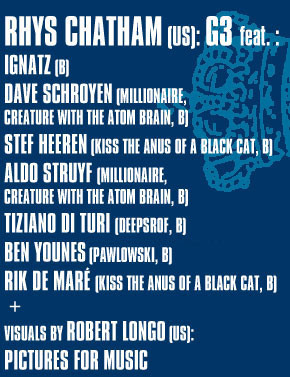 Voor de halte in kunstencentrum BELGIE gorden Rhys Chatham zelf, Ignatz, Stef Heeren (Kiss The Anus Of A Black Cat), Aldo Struyf (Millionaire, Creature With The Atom Brain), Tiziano Di Turi (Deepsrof) en Rik De Maré (Kiss The Anus Of A Black Cat) de gitaar om. Ben Younes (Pawlowski) op bas en Dave Schroyen (Millionaire, Creature With The Atom Brain) aan de drums voeden het geheel met de nodige ritmische zuurstof. Gezamenlijk knallen ze G3 naar een nieuw hoogtepunt met de schitterende visuals van muzikant en beeldend kunstenaar Robert Longo ‘Pictures For Music’ dansend op uw netvlies.